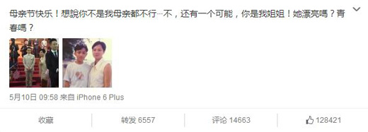 昨日是母亲节,王祖蓝微博晒出与妈妈合照,向母亲表示祝福,称:“母亲节快乐!想说你不是我母亲都不行…不,还有一个可能,你是我姐姐!她漂亮吗?青春吗?”两张照片一张是王祖蓝少年时期和母亲的合照,另一张是近期王祖蓝婚礼时两人的合照,可以看出两人长相十分相似,几乎难以分辨。